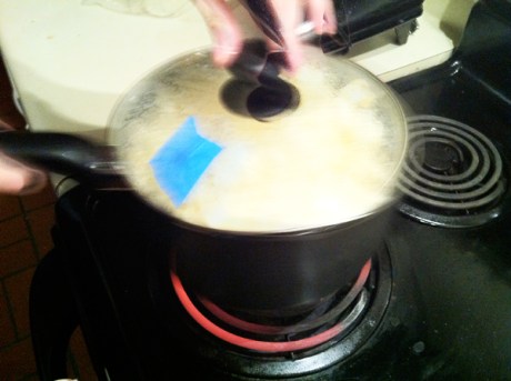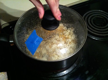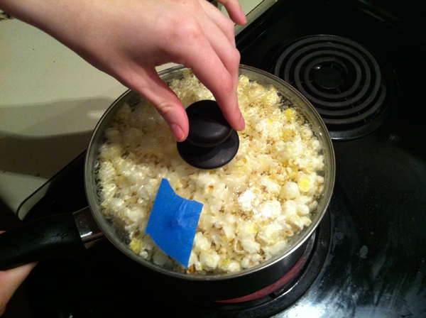 When the first kernel pops, hold down the lid. (If you have a steam hole, you may want to cover it with something you have on handโ€ฆsay, painterโ€™s tapeโ€ฆ so that grease doesnโ€™t escape and burn you.)