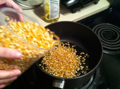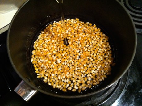 Sprinkle a thin layer of corn kernels on top of the oil.