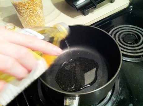 Pour a liberal dose of oil in a small saucepan on high heat. (We used olive oil, but canola or vegetable would probably be delicious as well.)