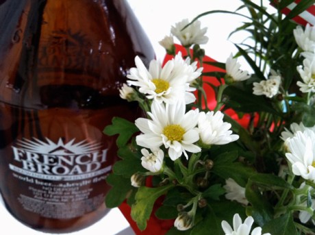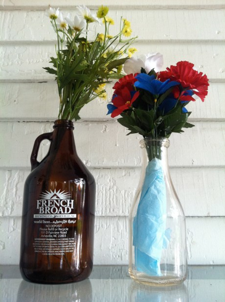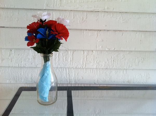 Decorations can get expensive, but I was determined to use what I had. I found some flowers from last year’s bash, and placed them in an antique milk bottle my grandmother gave me.