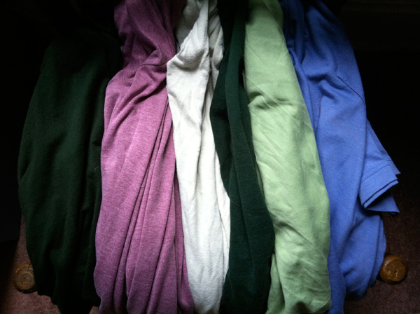 We used… guess… (hint: the title gives it away)… old t-shirts! We already had several of the shirts, and the rest we thrifted at a local yard sale sponsored by friends for charity. (That’s a win-win combo right there!)